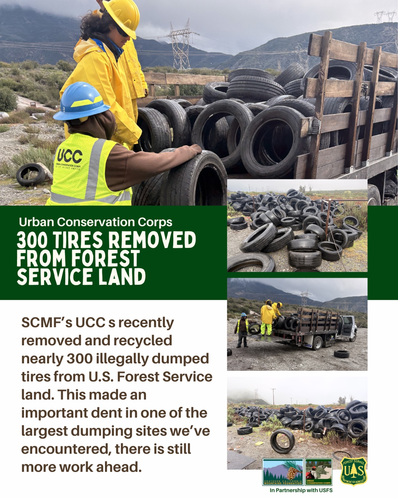 The Southern California Mountains Foundation’s Urban Conservation Corps removed and recycled nearly 300 illegally dumped tires from U.S. Forest Service land. This site represents one of the most extensive illegal dumping areas our team has encountered on public lands. While removing 300 tires has made an important impact, it is only the beginning, and our crews will continue returning to the site to remove more waste and restore the landscape.