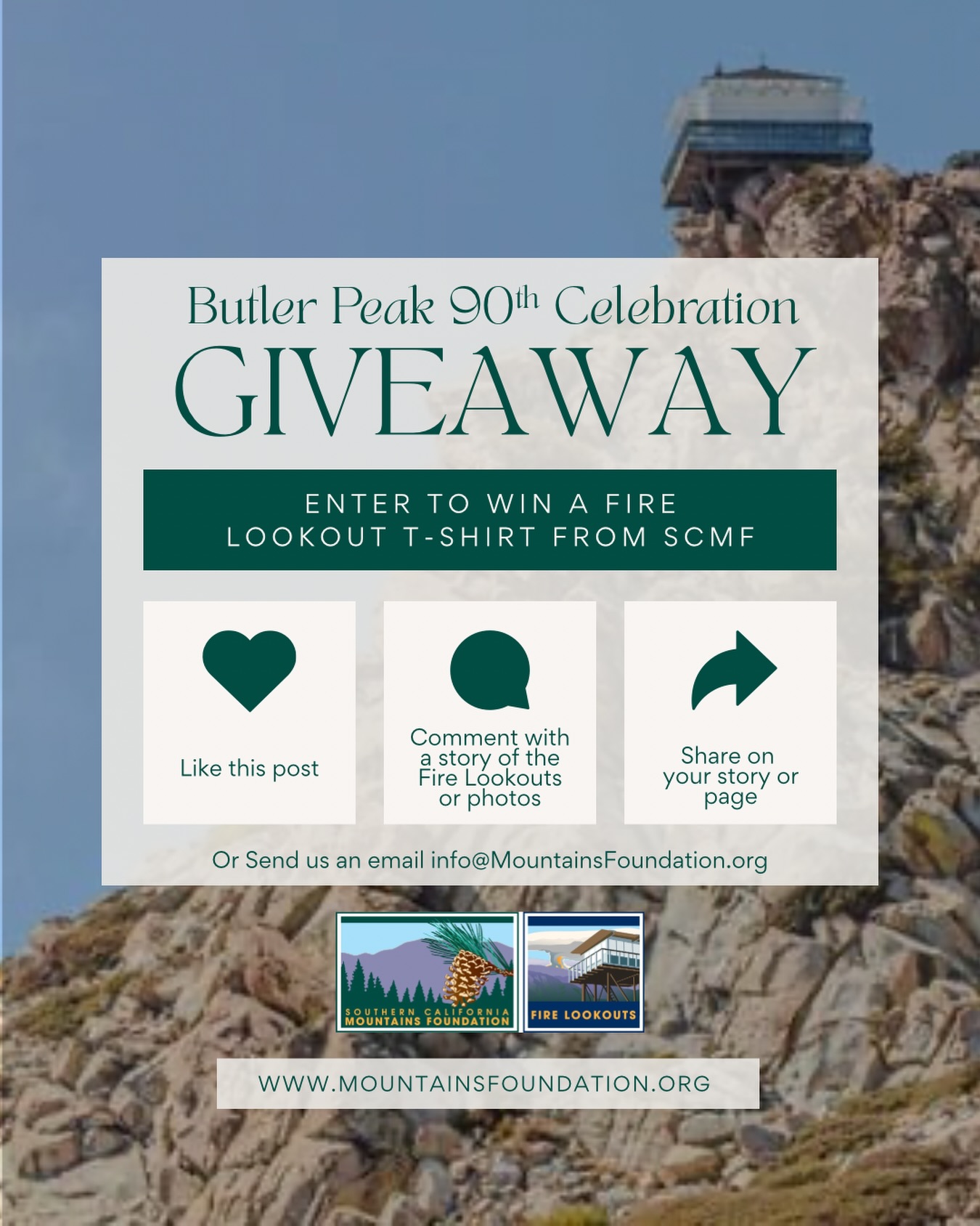 To honor this milestone, the Southern California Mountains Foundation is launching a special giveaway. One participant will receive a Butler Peak signature Fire Lookout print or a Southern California Mountains Foundation Fire Lookout t-shirt.